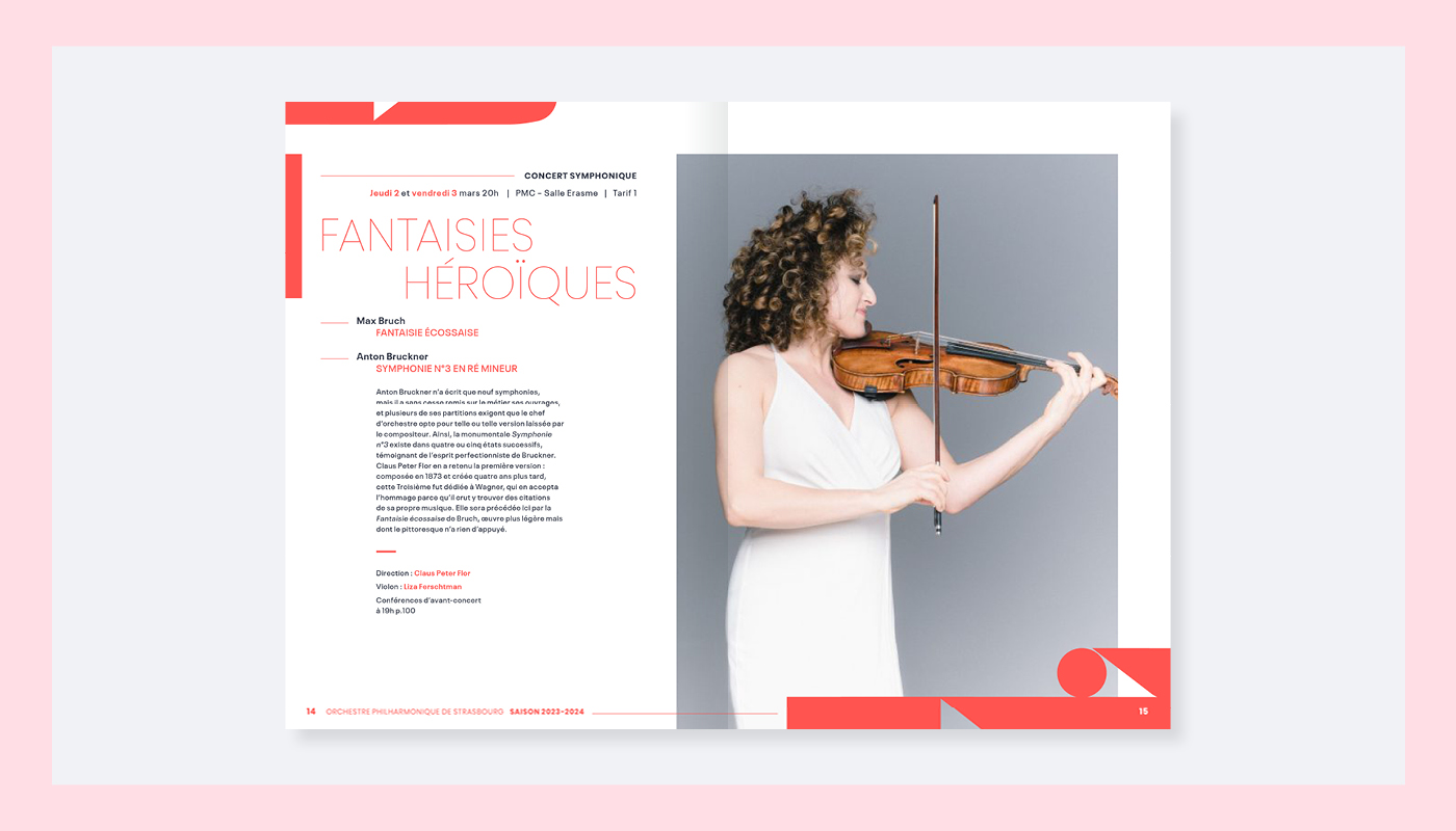 The Orchestre philharmonique de Strasbourg has launched a competition between creative agencies to develop the 2022-2023 Season Brochure. Distributed very widely each year, it is a major source of information for the public. A veritable roadmap, the brochure lists all the concerts of the season, sheds light on the program, while highlighting certain personalities of the Orchestra. Finally, it brings together a number of practical information for the public such as the various subscriptions offered. Below is the proposal we envisioned for this contest.